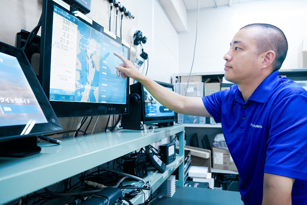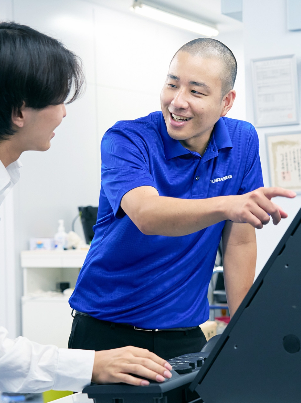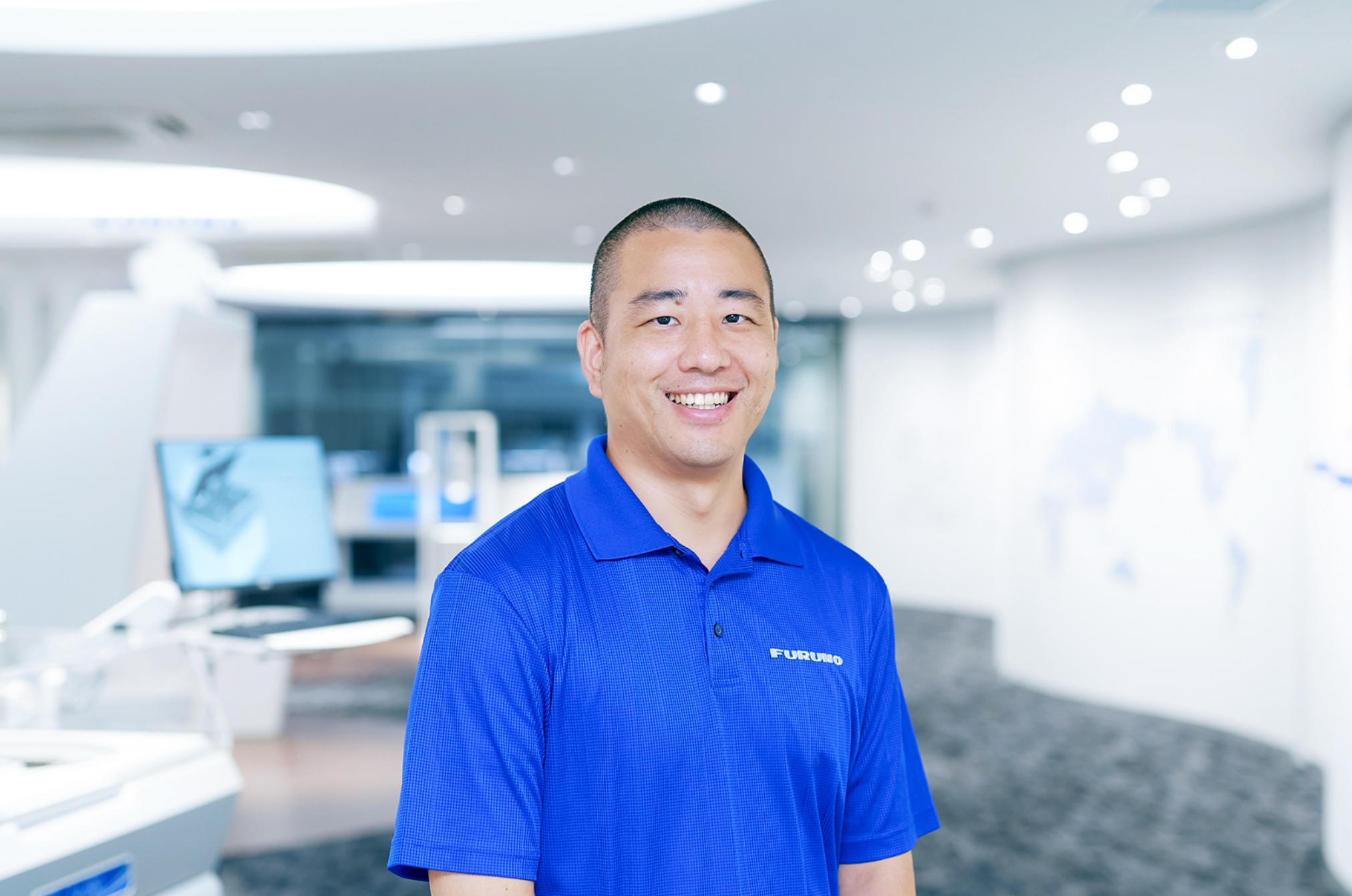 学生時代に海洋資源計測学を専攻していた私は、魚群探知機やソナーなどの製品を利用する機会がたくさんあり、当時からフルノは身近な存在でした。そして、毎月のように船で調査を行っていたため、船舶関連の方々には大変お世話になりました。そのときの恩返しをしたいという想いもあり、船に乗る方々に貢献できるフルノへ入社したのです。