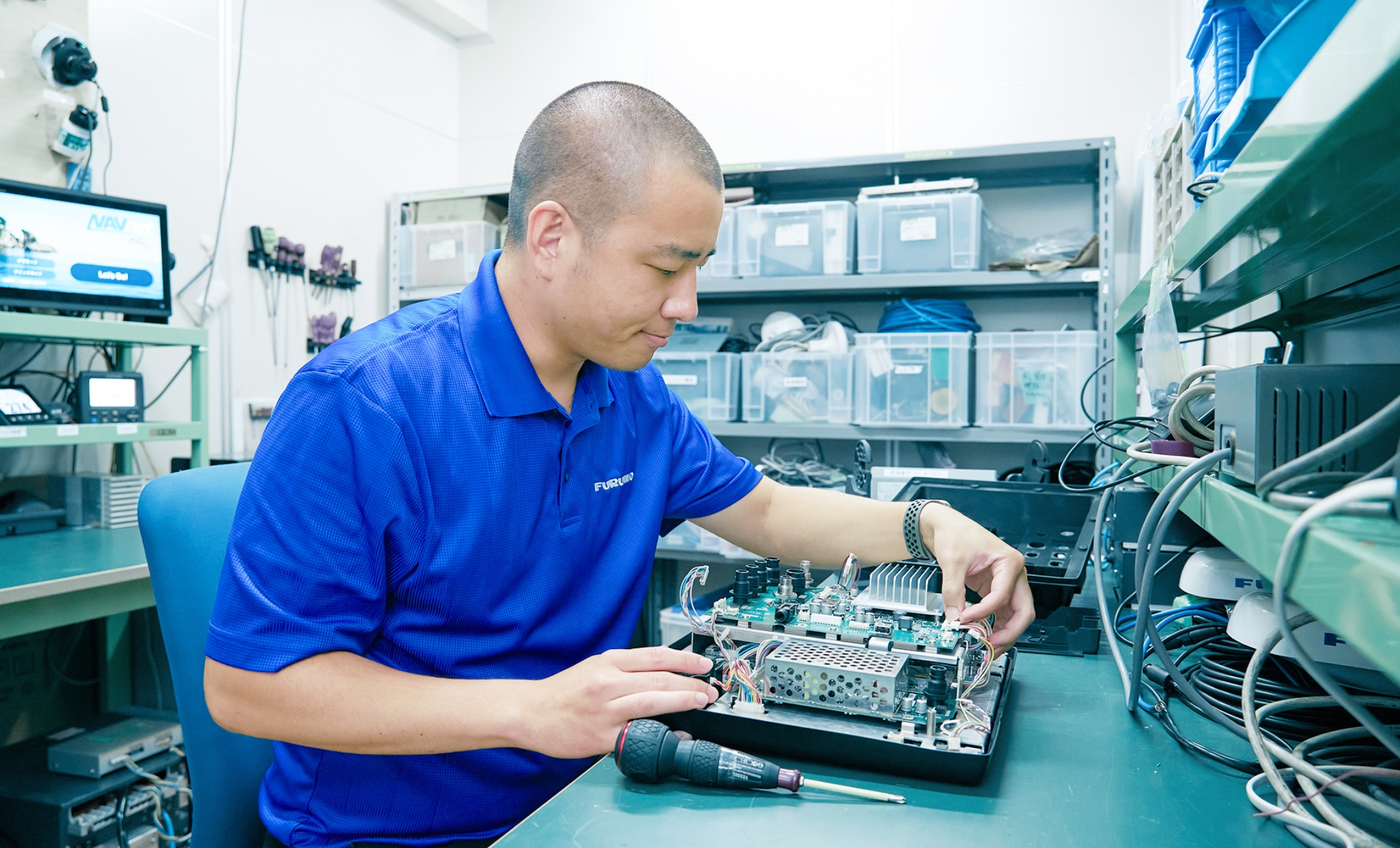 国内外のお客様、そしてフルノの技術員に対し、船舶用電子機器に関する技術支援を行っています。フルノの製品を利用しているお客様からは、日々さまざまな技術的なお問い合わせが寄せられます。そうしたお問い合わせ一つひとつに丁寧に対応するとともに、必要であれば世界各地のお客様のもとを訪れて詳細な調査や対応を行います。また、定期的に技術や新商品についての研修を開催し、技術員に現場で必要となる知識やスキルを紹介しています。毎年、世界中の技術員を集めた技術研修会も開催しており、そうした会の運営も私たちの業務のひとつです。さらには、技術支援のなかでお聞きしたお客様の声を活かすために、新製品のプロジェクトにも参加し、研究開発部門のメンバーとともに開発に取り組んでいます。